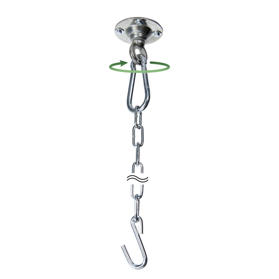 De Amazonas Power Hook bestaat uit een speciale haak incl. kogellager, ketting (ca. 78 cm, in hoogte verstelbaar), 4 bouten, 4 metalen pluggen.