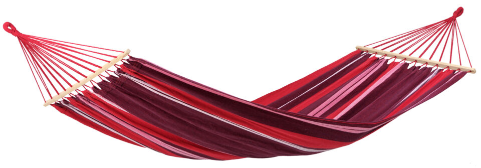 De stevige Amazonas Samba Fuego hangmat met spreidstok van weerbestendig en UV-bestendig EllTex-materiaal, dat extra lang meegaat en toch zo zacht is als katoen.